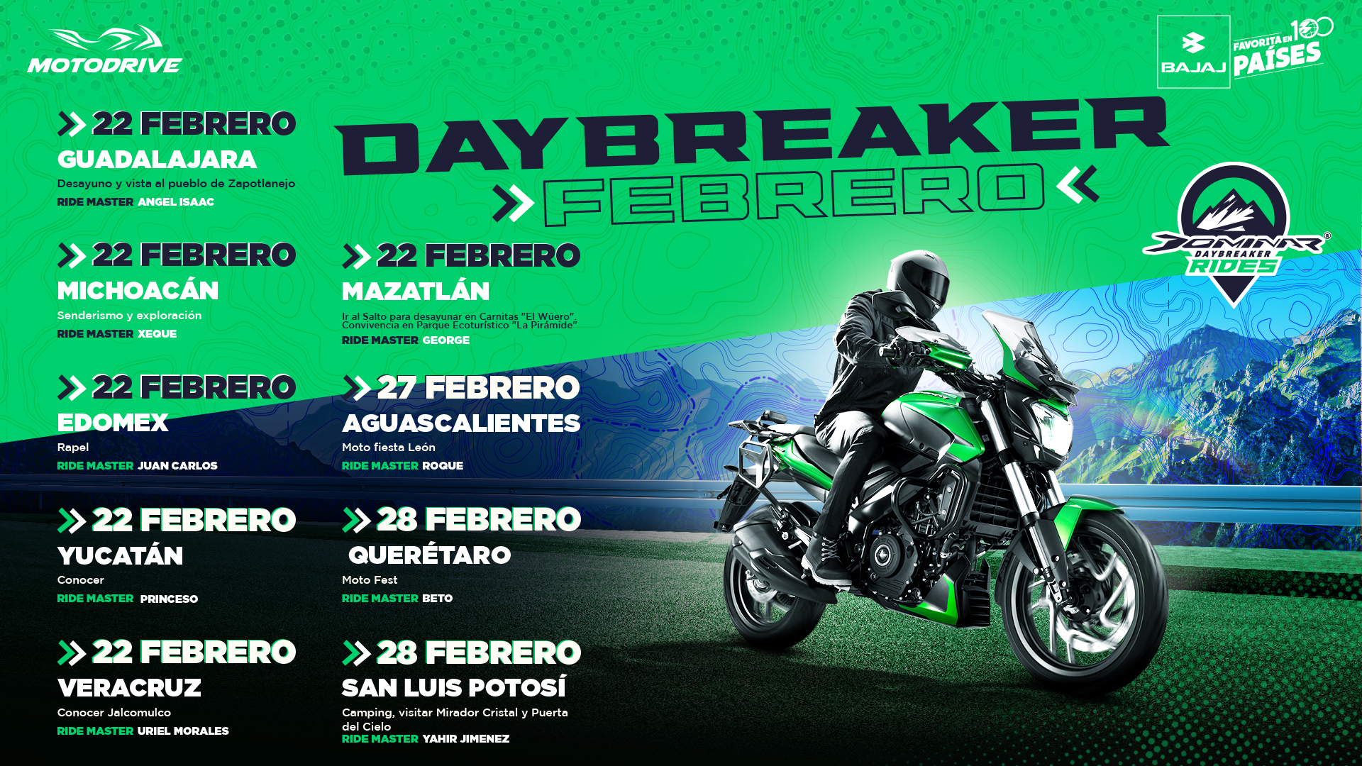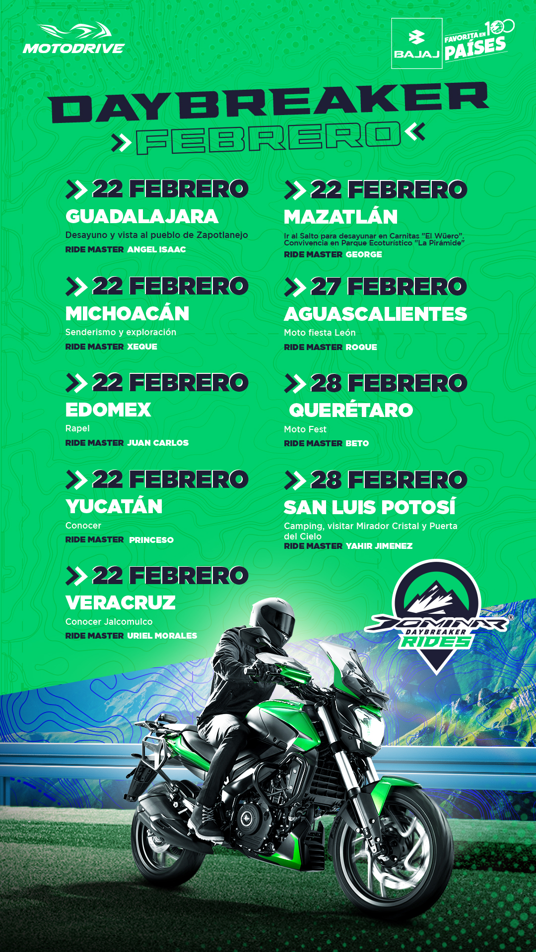 Este tipo de rodadas son always on, son rodadas organizadas por los ride master que no tienen ningún costo para los usuarios, pueden ser rodadas dentro y fuera de la ciudad, no hay un mínimo de km.
